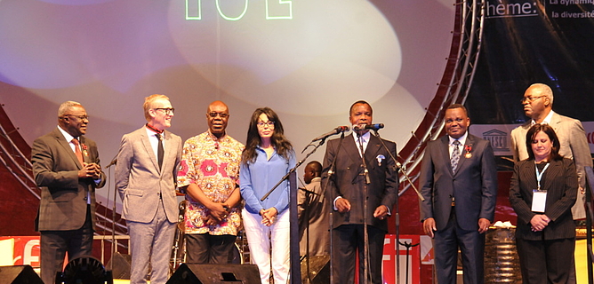 Ouvert le 18 juillet 2015 à Brazzaville en présence de Denis Sassou Nguesso et de ses parrain et marraine Manu Dibango et Yasmina Benguigui, la dizième édition Festival Panafricain de Musique se tient à Brazzaville jusqu'au 25 juillet... L'occasion d'entendre et d'admirer des stars de toute l'Afrique, à commencer par le bassin du Congo, plutôt bien représenté... L'ouverture du dixième FESPAM n'a pas été seulement un moment protocolaire lors duquel le Président Denis Sassou Nguesso, lui-même soutien permanent du Festival Panafricain de Musique depuis de longues années, a remis des décorations honorifiques à tous ceux qui oeuvrent pour faire de ce Festival un rendez-vous panafricain incontournable, malgré les aléas qu'il a pu connaître au fil des années. L'important c'est de durer et d'être au rendez-vous, et de continuer à offrir à l'Afrique une grande manifestation autour de la musique du continent. Placé, cette fois-ci, sous le thème " La dynamique des musiques africaines dans la diversité des expressions culturelles ", cette rencontre va connaitre la participation de grands noms de la musique africaine, à commencer par les stars du basin du Congo. Venus de RDC, on peut citer Koffi Olomidé et son " Quartier Latin International ", Jossart Nyoka Longo et son " Zaïko Langa-Langa N'kolo Mboka " , de Fabregas, de la Cléopâtre Mbilia Belle, et de Noël Ngiama Makanda Werrason et son " Wenge Musica Maison Mère " ... Une occasion de réconciliation par la musique après les frictions qui ont pu exister entre les 2 Congos à l'occasion de l'expulsions de certains "zaIrois" hors du territoire de la République du Congo au cours de la dernière année. Le Congo-Brazzaville, de son côté, aligne Zao, Roga-Roga, Doudou Copa notamment... Le partenariat avec Cuba donne historiquement à la musique du Congo Brazzaville une tonalité particulière, les échanges culturels ayant été intenses au cours des dernières décennies... Et c'est ainsi le groupe Aragon sera présent, venu de Cuba, tandis que la dimension panafricaine sera marquée par exemple par la présence du Nigeria avec J. Marcus, ou de la Côte d'Ivoire avec DJ Arafat. Comme toujours, RFI est partenaire du FESPAM et l'ambassadeur permanent des musiques africaines, Claudy Siar, a bien entendu fait le déplacement...