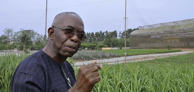 La petite exploitation d'à peine un hectare qu'il a créée en 1985 à Porto-Novo est devenue un projet-pilote pour le reste de l'Afrique. Le centre s'étale aujourd'hui sur 24 hectares où une armée d'employés et d'apprentis s'active dès l'aube à la production de denrées agricoles, à leur transformation et leur distribution. Fruits et légumes, riz, élevage de poissons, de porcs, et de volailles, avec un principe: "rien ne se perd, tout se transforme", pour préserver l'environnement. Les fientes de poules sont transformées en bio-gaz, qui alimente les cuisines du centre. Les pièces détachées des engins agricoles sont réutilisées pour la fabrication d'ingénieuses machines. Les eaux usées sont filtrées grâce à des jacinthes. Désigné "centre d'excellence pour l'agriculture" par les Nations unies, Songhaï s'est développé au Nigeria voisin, au Liberia et au Sierra Leone et a pour projet de s'implanter dans 16 pays d'Afrique de l'Ouest et centrale, au total. Le casse-tête auquel tente de répondre cet Américain d'origine nigériane: aider les Africains à augmenter leurs rendements agricoles à travers des techniques simples, sans avoir recours à des engrais et des pesticides, souvent utilisés sur le continent. Ceci afin d'abaisser les coûts de production tout en préservant l'environnement. Le prêtre dominicain élevé en Californie dit avoir été très choqué par les images terrifiantes de famine en Afrique, à la télévision, au début des années 80. Il est donc parti à la découverte du continent, pour voir de quelle façon il pouvait mettre à profit sa formation universitaire en agronomie, économie et informatique et lutter contre la pauvreté à son échelle. Après avoir visité plusieurs pays, il a atterri au Bénin, où le gouvernement --marxiste à l'époque-- lui a cédé un lopin de terre. "C'était un terrain abandonné, tué par l'engrais chimique et la pratique de l'agriculture conventionnelle. Ca ne marchait pas" raconte-t-il. "On était sept jeunes. On a creusé des puits, on a arrosé de nos mains... Et en pleine période de sécheresse, cette surface grise est devenue verte", se souvient-il dans un sourire. Son secret: imiter la nature, valoriser les "bonnes bactéries" présentes dans le sol pour maximiser la production sans avoir recours aux produits chimiques. Les rendements de Songhaï parlent d'eux-mêmes: La ferme produit sept tonnes de riz par hectare trois fois par an, contre une tonne de riz par hectare et par an à ses débuts. "L'Afrique relève la tête" Aujourd'hui, "Songhaï fait face au triple défi de l'Afrique aujourd'hui: la pauvreté, l'environnement et l'emploi des jeunes", explique le père Nzamujo. Dans le système qu'il a imaginé, détaillé dans son livre, L'Afrique relève la tête, la production locale est transformée et distribuée sur place, ce qui permet de lutter contre la pauvreté en créant une activité économique. A Songhaï, des confitures mijotent dans de gros chaudrons, pendant que les poulets rôtissent. L'huile de soja, le riz, les jus de fruit sont empaquetés pour être vendus dans la boutique ou servis dans le restaurant du centre. Ce projet presque autarcique a également un point d'accès internet et une banque, évitant ainsi aux résidents de devoir se rendre en ville. Enfin, l'emploi des jeunes est encouragé avec la formation de 400 élèves-fermiers chaque année, sélectionnés sur concours, qui bénéficient d'une formation de dix-huit mois entièrement gratuite. Paul Okou, 25 ans, est l'un d'entre eux. Ce fils d'agriculteurs de Parakou, dans le nord du Bénin, aimerait reprendre l'activité de ses parents, mais espère travailler de façon plus rentable. "Mes parents utilisent des méthodes archaïques traditionnelles, alors qu'à Songhaï on apprend la méthode moderne, mais artisanale!" s'enthousiasme-t-il. "Ce qu'on faisait en deux jours, maintenant on le fait en deux heures". Les élèves-fermiers sont ensuite envoyés dans des villages où ils mettent en application ce qu'ils ont appris. Une fois en charge d'une exploitation, ils intègrent le réseau Songhaï et sont suivis régulièrement. Songhaï accueille aussi des stagiaires qui financent leur propre formation, à hauteur de 350 euros pour six mois, comme Abua Eucharia Nchinor, une trentenaire nigériane, et Kemajou Nathanaël, un ancien commercial camerounais de 39 ans. Tous deux ont le projet d'ouvrir une ferme bio dans leurs pays respectifs.