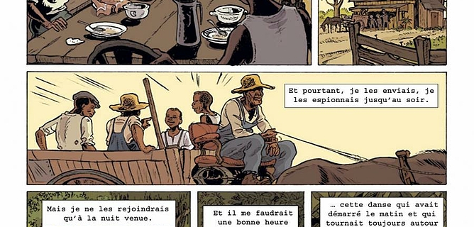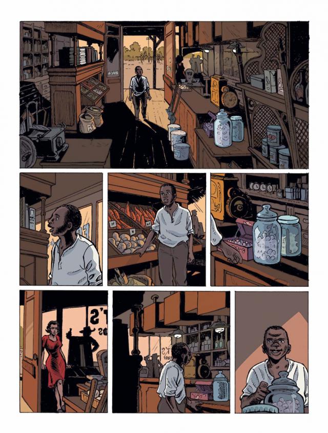 Comment avez-vous pris connaissance de cette histoire, et qu’est-ce qui vous a donné envie de la raconter?? À la fin des Racines du Ciel, Romain Gary écrit un pamphlet dans lequel il raconte l’histoire d’Emmett Till, sans le nommer. D’autres auteurs parlent de cette histoire terrible, toujours sur le ton de la colère et de la révolte. Comment vous êtes-vous documenté?? J’ai lu beaucoup d’ouvrages sur la question, mais aussi sur l’histoire des États-Unis, ainsi que des romans policiers. J’ai vu aussi des films américains des années cinquante, ainsi que Dans la brume électrique, de Bertrand Tavernier. Et j’ai accumulé une grosse documentation graphique. À partir de toute cette matière, j’ai construit ma propre histoire.