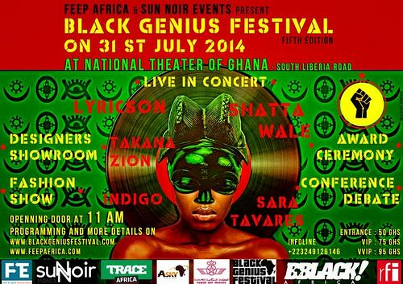 La 5eme édition du BLACK GENIUS FESTIVAL aura lieu au prestigieux théâtre national d’ACCRA (Ghana). Une vitrine internationale de la créativité noire, de génie et de talents, célébrant la diversité par le biais de la musique, l’artisanat et bien plus encore. Festivaliers, Vivez l ‘experience BLACK GENIUS FESTIVAL au Ghana!!!!!@ Le 31 Juillet 2014 avec une formule pacage ….. # Vol A/R Paris - Ghana # 7 jours - 6 nuits en demi pension pour # 950 euros Réservation sur : resa@blackgeniusfestival.com