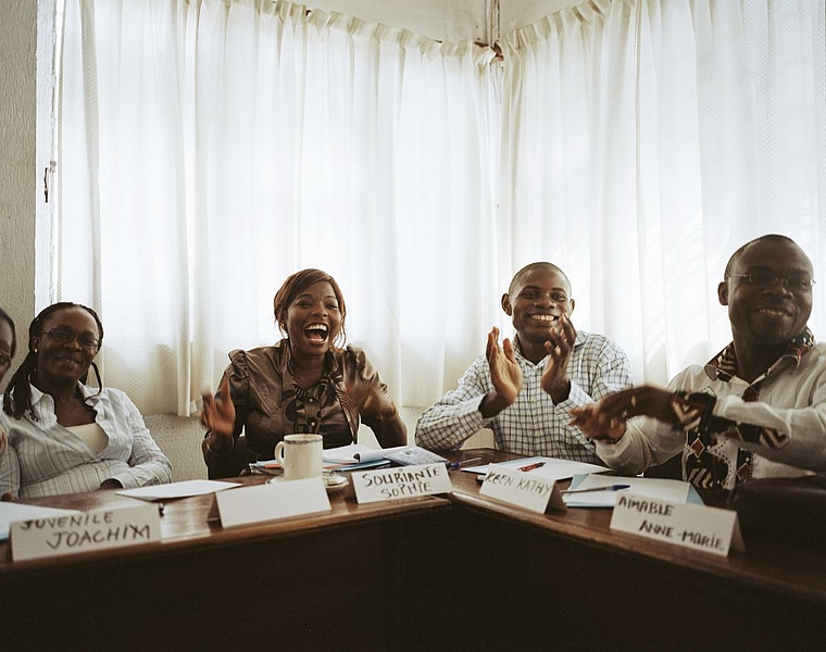 Séance de formation pour des cadres du secteur privé. Les participants applaudissent à la fin d'un jeu de rôle. Cameroun. © Joan Bardeletti