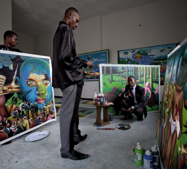 Pierre Bodo (assis) au milieu de ses toiles, avec ses fils, Amani et Bodo fils (au centre), peintres eux aussi. © Pascal Maître Vieux baroudeur de l'Afrique profonde, le photographe Pascal Maitre a été emporté par le dynamisme des artistes kinois : " Ils gambergent très loin parce qu'il leur faut se démarquer. C'est la seule condition pour qu'on te remarque, que tu attires un public et puis, peut-être, un producteur. " L'art africain contemporain explose. La première foire qui lui a été consacrée, à Londres, à l'automne 2013, ne mentionnait même plus son origine géographique, se contentant comme intitulé d'un énigmatique " I.54 ". Un continent, 54 pays. L'Afrique se réveille. A Kinshasa, on est fier d'être à l'origine de ce renouveau qui s'offre des expérimentations délirantes tout en demeurant très ancré dans le quotidien et l'imaginaire locaux. " Tout commence en 1970, avec l'exposition "Art partout" ", explique André Magnin, le directeur artistique de la Contemporary African Art Collection, la collection privée de Jean Pigozzi, héritier d'une célèbre marque automobile française.