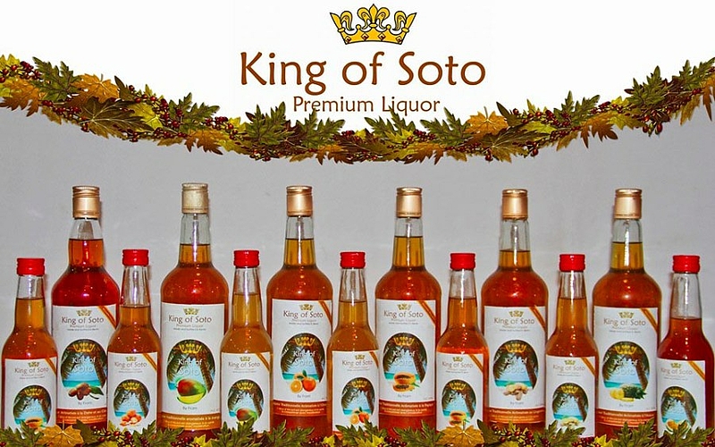 King of Soto est tout simplement composé de sodabi local, de fruits et d'épices. Au total, une dizaine de parfums différents à base de fruits tels que l'ananas, l'orange, la mangue, la papaye et d'autres, saisonniers (la passion, la fraise etc.). La production est longue et se déroule en plusieurs étapes. Faire de la liqueur nécessite des contenants adéquats, notamment en aluminium, ou des tonneaux de bois utilisés pour la fabrication du vin. Ces articles sont indisponibles au Bénin et coûtent chers à la commande. Mabel utilise donc des " dame-jeanne ", récipients de 20 litres dont on se servait à une époque donnée pour conserver le Sodabi, et qui sont utilisés par les vendeurs d'essence frelatée. Les fruits et les épices y sont insérés avec le sodabi, puis le mélange est rigoureusement conservé et stocké à l'abri du soleil, dans un endroit aéré pendant six à douze mois, avant d'être récolté puis embouteillé. Il s'agit donc d'une liqueur fabriquée de façon artisanale et sans additif chimique. Un sodabi trié sur le voletIl provient de plusieurs producteurs locaux d'Allada, de Zè ou encore Avrankou pour les prochaines commandes. En effet, la fabrication de sodabi, qui est extrait du vin de palme, n'est pas une activité qui s'exerce pendant toute l'année au Bénin. Cette eau de vie n'est donc pas disponible en quantités industrielles. Cependant, Mabel est très exigeante quant à la qualité de sodabi qu'elle emploie pour la fabrication du King of Soto. Lorsqu'on commence à extraire le sodabi du vin de palme, Le produit de la première distillation a un taux d'alcool proche des 90 degrés. Cela agresse les papilles et laisse une haleine for déplaisante. Pour réaliser King of Soto, elle utilise du sodabi distillé plusieurs fois, jusqu'à l'obtention du produit fini beaucoup plus raffiné. La genèse du produit