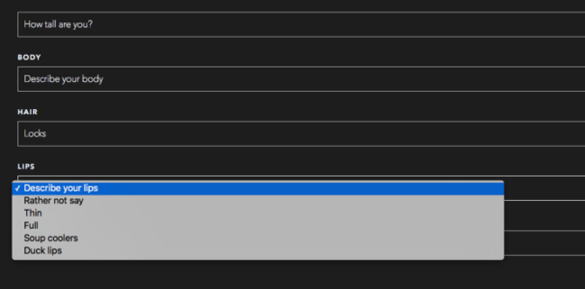 Des préférences pleines de préjugées racistesPlus loin, on retrouve une catégorie spécialement dédiée au type de lèvres. Oui vous avez bien lu. Et en option, on trouve " soup coolers ", une expression péjorative pour désigner des grosses lèvres.